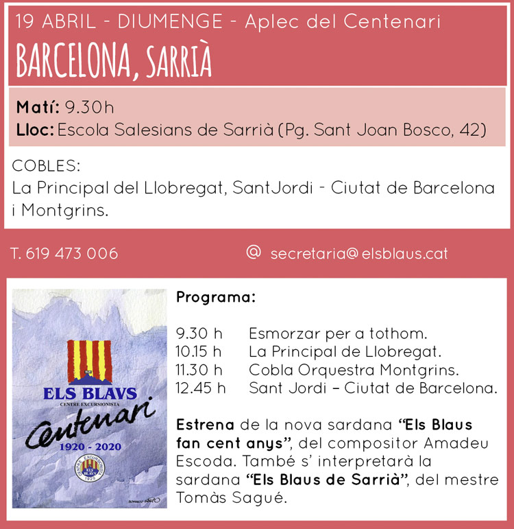 El darrer cop que va tenir lloc un aplec de sardanes a Sarrià va ser l’any 1983 i precisament, el va organitzar el Centre Excursionista Els Blaus en el pati de l’escola dels Salesians. Per aquest motiu, hem recuperat aquest esdeveniment per celebrar el nostre Centenari.